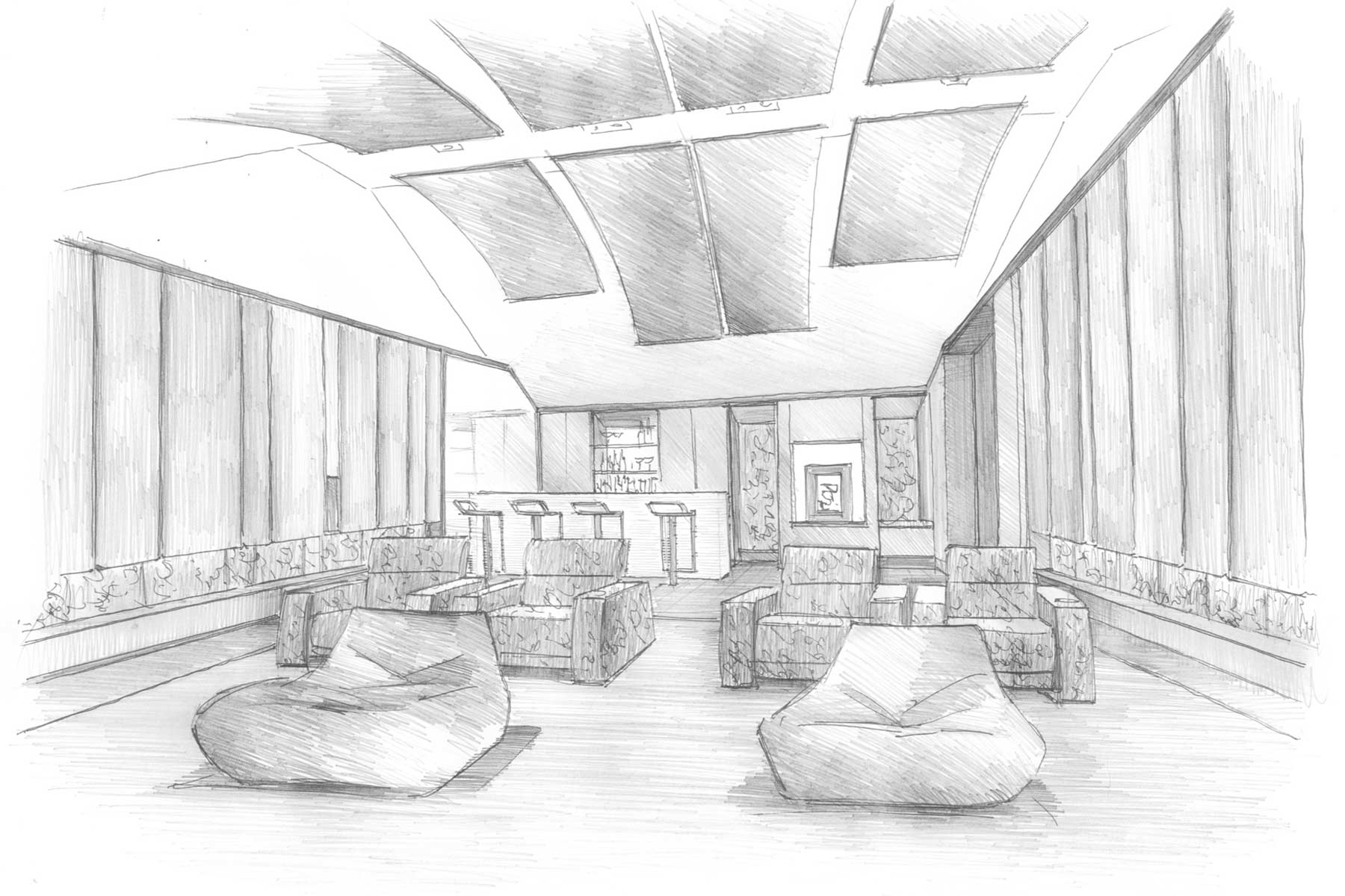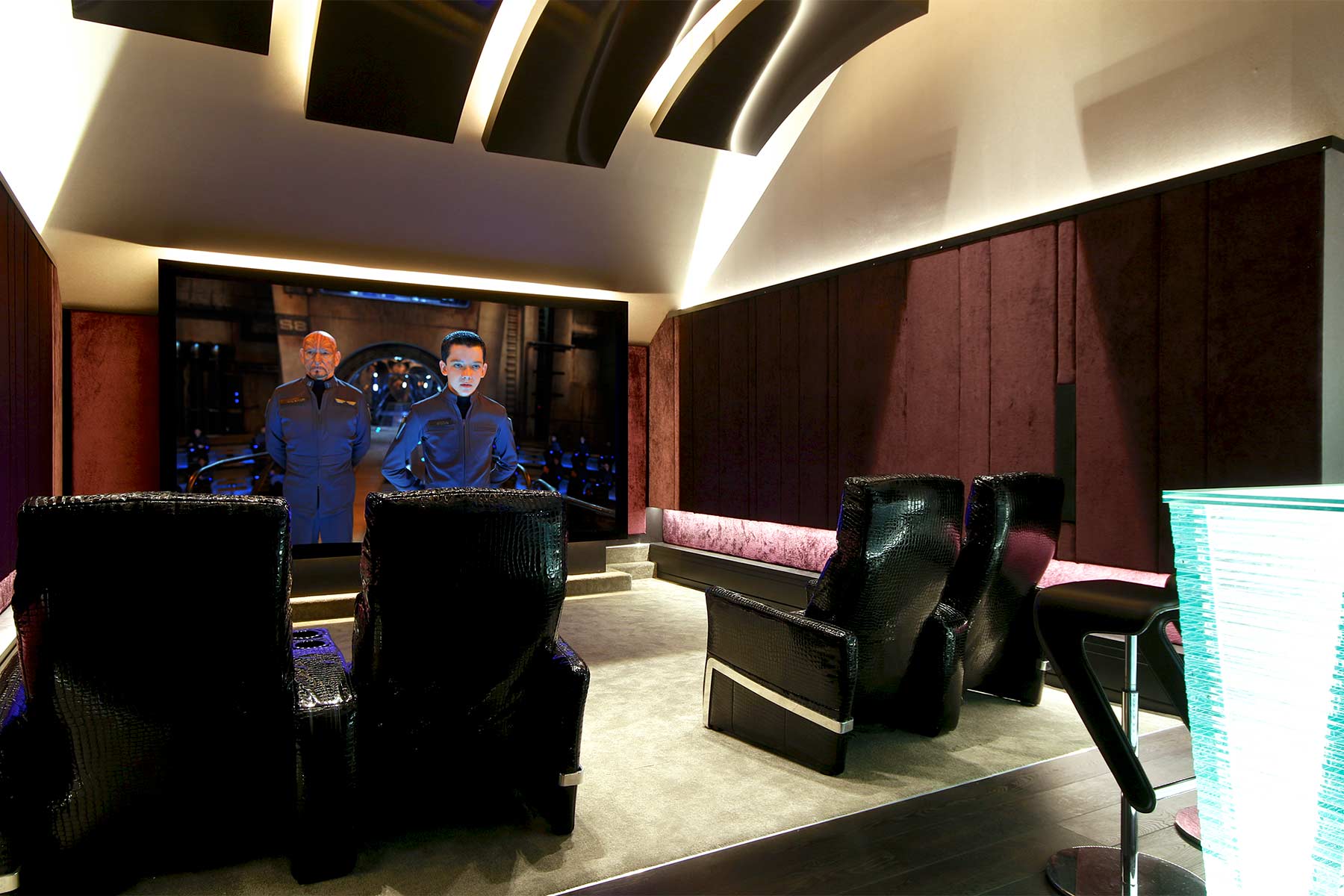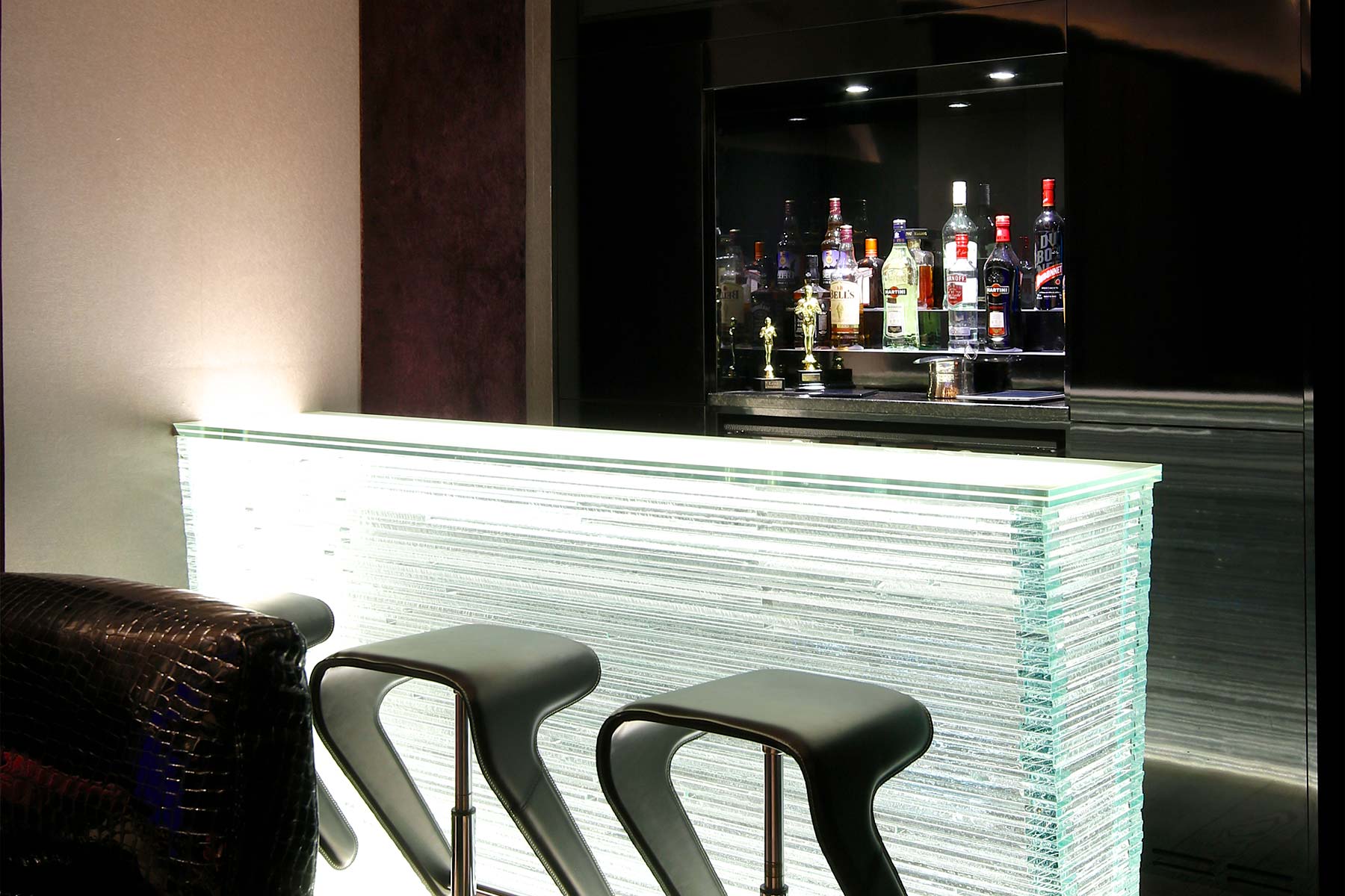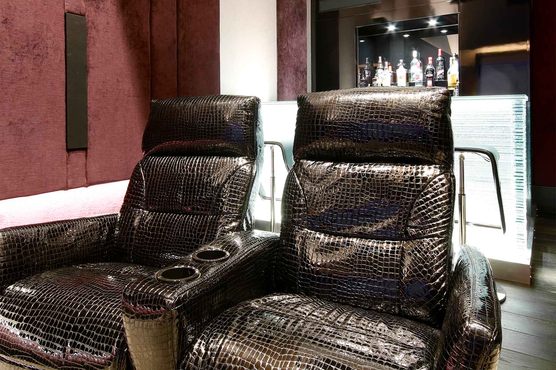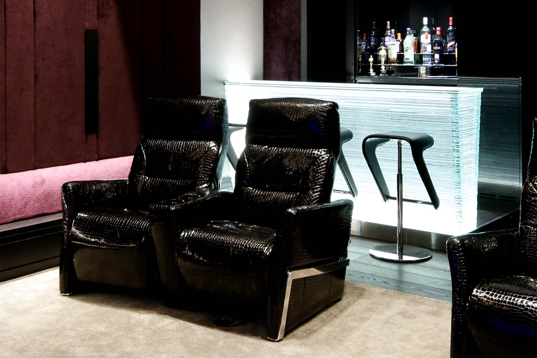 Towards the rear of the room, and integrated into the lighting system, the handmade glass bar adds a visual focal point and serves as a relaxing place to sit and enjoy a drink before settling down into the specially commissioned, reclining, crocodile skin, cinema seats to enjoy the film.