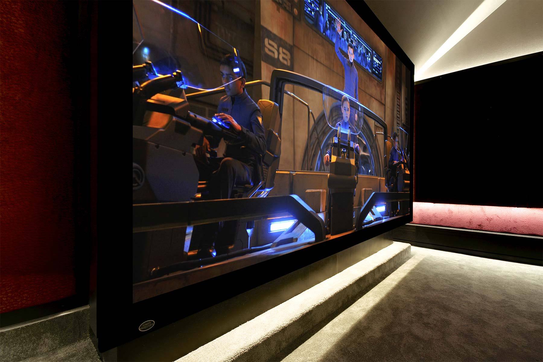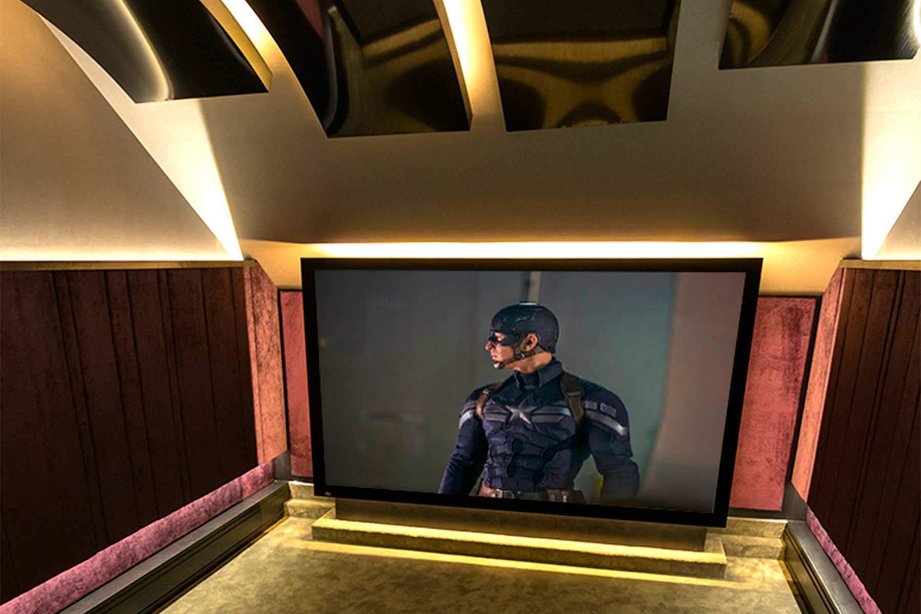 The vaulted ceiling was the first challenge that this install presented to the Clearly Automated team. Cinemas are not usually installed into such buildings and the acoustic problems had to be overcome before any work could commence. Taking inspiration from Leeds Town Hall, a very popular classical music concert venue which also features a cathedral style ceiling, the team installed specially designed curved acoustic panels above the screen and seating area. Acoustic walls complete the room treatment and all feature integrated and hidden LED lighting used to create moods within the room.