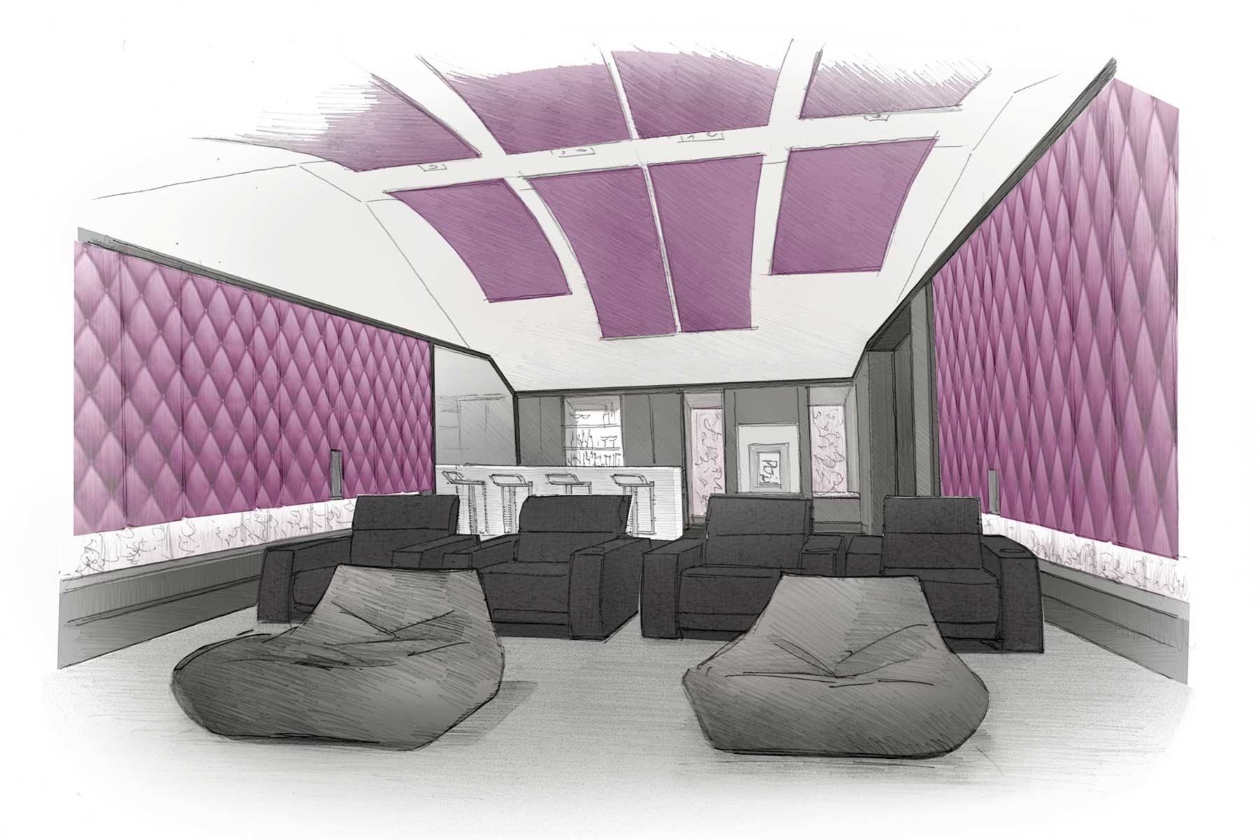 This outstanding barn conversion saw us working seamlessly with a knowledgeable property developer owner and the luxury door and The Bromberg family had recently completed a 5m x 7m extension to their house, which included a pitched cathedral-like roof. Into it they wanted to install a bespoke home cinema, big enough for the family of six to enjoy the movie and relax at the bar. The installation had to maintain the feature vaulted ceiling and be completed in just three months.